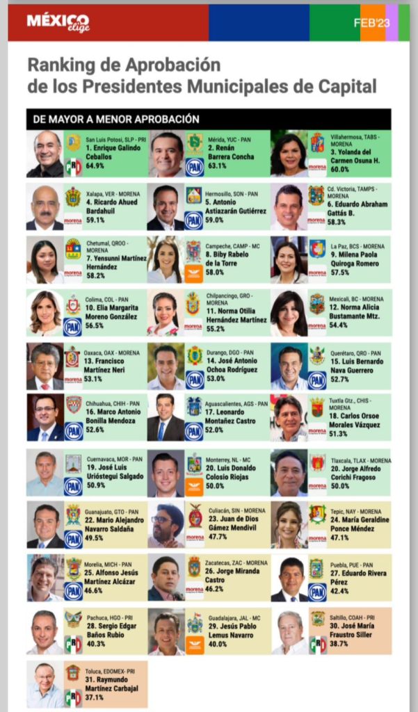 Con una aprobación del 58.3 por ciento, ocupó el sexto lugar en la encuesta del mes de febrero; resultado de las acciones, obras y política pública que ha realizado su administración en beneficio de la población a través del eje rector de su gobierno «Victoria Te Quiero Más».